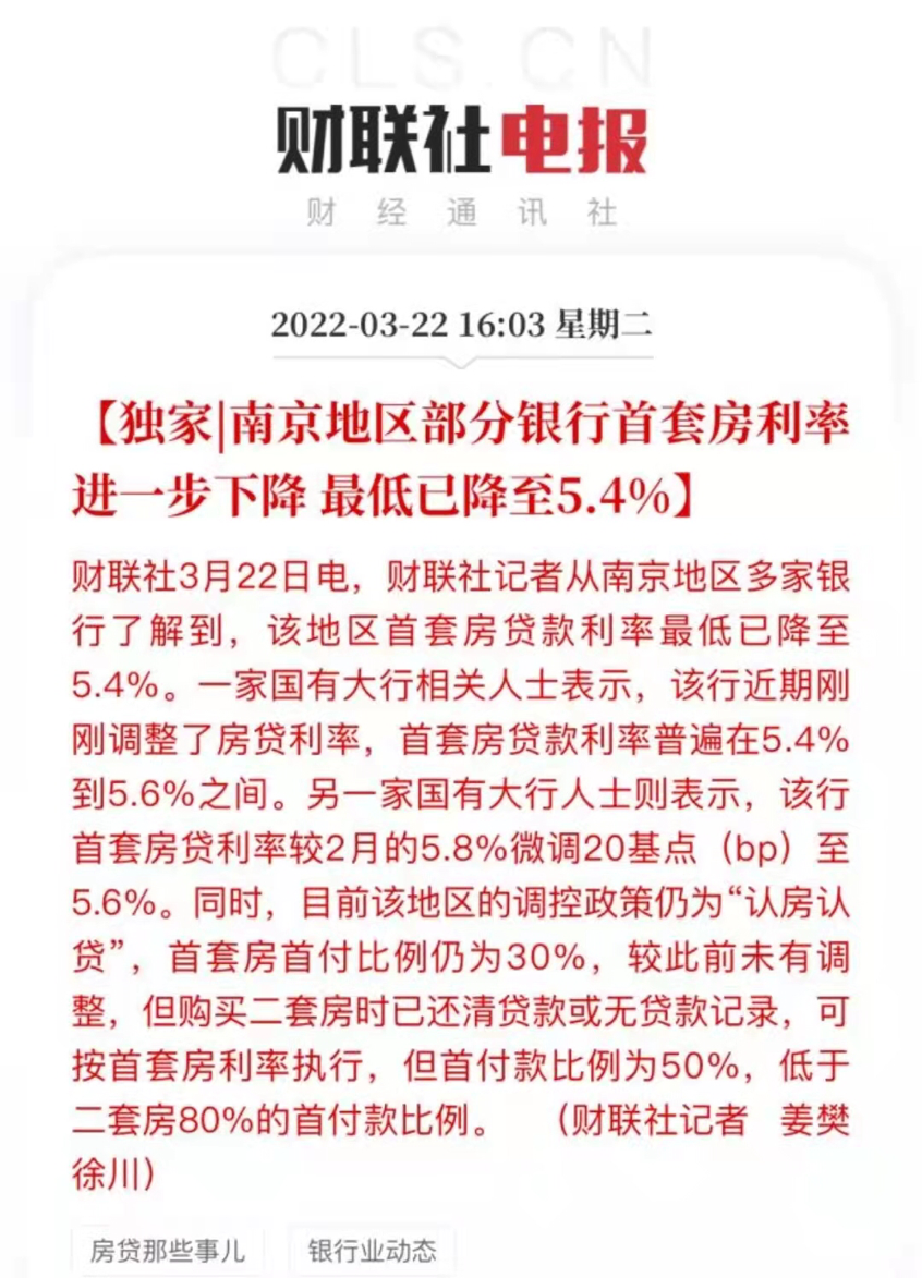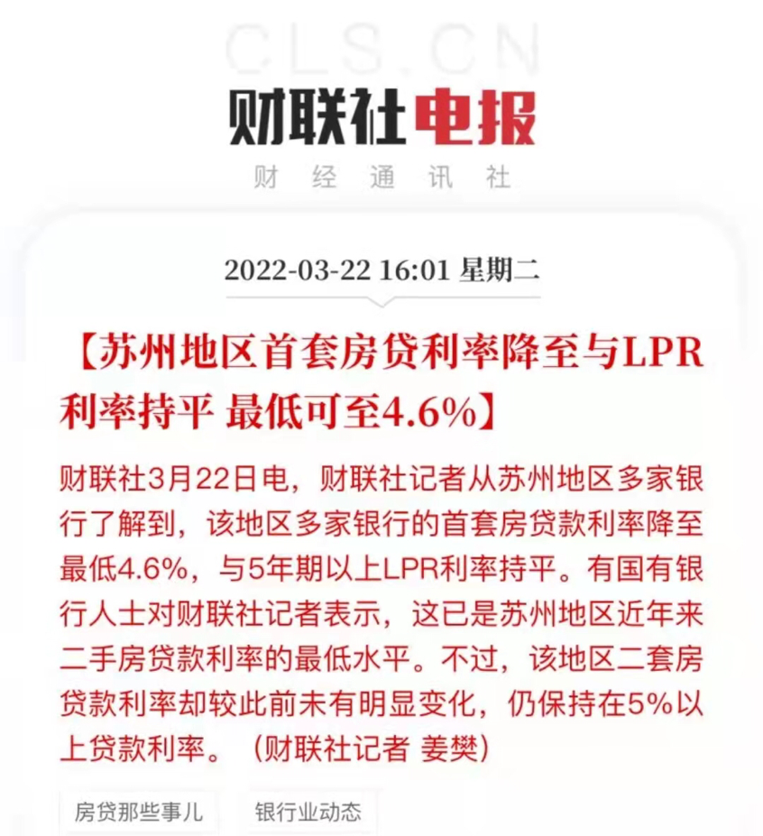 3月22日,南京地區(qū)部分銀行首套房利率進(jìn)一步下降,最低已降至5.4%。蘇州地區(qū)首套房貸利率降至與LPR利率持平,最低可至4.6%。中國(guó)經(jīng)濟(jì)發(fā)展龍頭—長(zhǎng)三角部分核心城市啟動(dòng)降低首套房貸利率,其他城市指日可待。