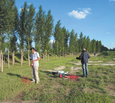 中科院沈陽應用生態(tài)研究所防護林研究團隊宋立寧研究員(左)和盧德亮博士(右)在科爾沁沙地農(nóng)田防護林帶利用大地阻抗儀測定地下水位。