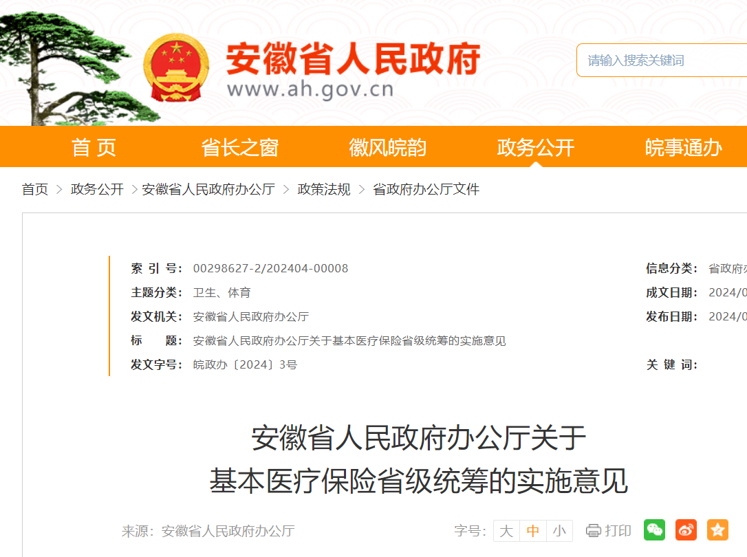 | 安徽發(fā)布基本醫(yī)保省級統(tǒng)籌實施意見 |