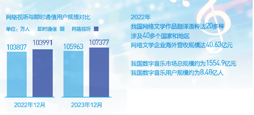 精神文明建設(shè)和經(jīng)濟(jì)建設(shè)的陣地 敖 然 以生成式人工智能、大數(shù)據(jù)、云計算為代表的信息技術(shù)革命帶來新的契機(jī),龐大的網(wǎng)絡(luò)用戶規(guī)模和巨大的消費需求,將為網(wǎng)絡(luò)文藝模式的創(chuàng)新、業(yè)態(tài)的創(chuàng)新提供新的機(jī)遇 網(wǎng)絡(luò)文藝兼具文化價值和經(jīng)濟(jì)價值,是精神文明建設(shè)和經(jīng)濟(jì)建設(shè)的重要陣地,更是建設(shè)中華民族現(xiàn)代文明、推進(jìn)文化強(qiáng)國建設(shè)、服務(wù)數(shù)字中國發(fā)展的主戰(zhàn)場。 網(wǎng)絡(luò)文學(xué)為提升中華文化海外傳播力、影響力發(fā)揮重要作用。根據(jù)中國音像與數(shù)字出版協(xié)會測算,2022年我國網(wǎng)絡(luò)文學(xué)出海作品共計53.93萬部,翻譯語種達(dá)20多種,涉及40多個國家和地區(qū),網(wǎng)絡(luò)文學(xué)企業(yè)海外營收規(guī)模已達(dá)40.63億元。以網(wǎng)絡(luò)文學(xué)為代表的中國網(wǎng)絡(luò)文藝,在海外落地生根、開花結(jié)果,影響力逐步增強(qiáng)。如《大國重工》《大醫(yī)凌然》等16部網(wǎng)文作品被收錄至世界知名學(xué)術(shù)圖書館,一些翻譯作品閱讀量破億。通過閱讀中國網(wǎng)文,海外讀者正在深入了解中華傳統(tǒng)文化和當(dāng)代中國的時代風(fēng)貌。 2022年,中國音像與數(shù)字出版協(xié)會根據(jù)國內(nèi)30余家主要數(shù)字音樂企業(yè)的同口徑測算,包括在線音樂、音樂短視頻、音樂直播、在線K歌業(yè)務(wù)在內(nèi)的中國數(shù)字音樂市場總規(guī)模約為1554.9億元,相較2021年,同比增長16.8%;中國音樂短視頻市場規(guī)模為410.3億元,較上一年增長19.8%。規(guī)模更大的是中國音樂直播市場,規(guī)模為815.2億元。這一組數(shù)據(jù)將以音樂為主要內(nèi)容或者與音樂直接相關(guān)的直播納入統(tǒng)計范圍,與音樂關(guān)聯(lián)度不高的領(lǐng)域或者直播類型,比如電商直播、旅游直播、生活類直播沒有納入統(tǒng)計。 短視頻已經(jīng)成為人們發(fā)現(xiàn)新歌的主要渠道。2022年,我國數(shù)字音樂用戶規(guī)模大約是8.48億人,用戶付費率持續(xù)上漲。雖然與發(fā)達(dá)市場的付費轉(zhuǎn)化率相比仍然偏低,但比過去已經(jīng)增長了很多。音樂短視頻用戶數(shù)量超過6.5億人,入駐短視頻平臺的音樂人超過150萬人??傮w來看,我國數(shù)字音樂行業(yè)在版權(quán)治理、行業(yè)基礎(chǔ)設(shè)施建設(shè)方面仍存在明顯不足,下一步需要在內(nèi)容精品化、技術(shù)賦能以及國際化發(fā)展等方面加大推進(jìn)力度,形成內(nèi)容豐富、模式多元、影響力更強(qiáng)的數(shù)字音樂新生態(tài)。 網(wǎng)絡(luò)視聽行業(yè)已成為我國網(wǎng)絡(luò)文藝的重要供給端。主旋律作品廣泛傳播,內(nèi)容生產(chǎn)精品化,正成為全行業(yè)高質(zhì)量發(fā)展的基本共識。目前,網(wǎng)絡(luò)視聽用戶規(guī)模已經(jīng)超過即時通信的用戶規(guī)模。根據(jù)《中國網(wǎng)絡(luò)視聽發(fā)展研究報告(2024)》,截至2023年12月,我國網(wǎng)絡(luò)視聽用戶規(guī)模達(dá)10.74億人,網(wǎng)民使用率為98.3%。用戶規(guī)模方面,網(wǎng)絡(luò)視聽與排在第二位的即時通信之間的差距進(jìn)一步拉大,網(wǎng)絡(luò)視聽的領(lǐng)先優(yōu)勢從2022年的184萬人,提升到2023年的1414萬人。2023年,移動端網(wǎng)絡(luò)視聽?wèi)?yīng)用人均單日使用時長超過3小時。為了更好地服務(wù)于數(shù)字文化創(chuàng)新創(chuàng)業(yè)和中華文化傳承傳播,今后需要進(jìn)一步加強(qiáng)內(nèi)容精品化引領(lǐng),強(qiáng)化主流媒體視頻的影響力和引導(dǎo)力。 以生成式人工智能、大數(shù)據(jù)、云計算為代表的信息技術(shù)革命帶來新的契機(jī),龐大的網(wǎng)絡(luò)用戶規(guī)模和巨大的消費需求,將為網(wǎng)絡(luò)文藝模式的創(chuàng)新、業(yè)態(tài)的創(chuàng)新提供新的機(jī)遇。同時,我們也不能忽視這些問題,諸如優(yōu)質(zhì)內(nèi)容供給、服務(wù)與多元文化消費需求之間的響應(yīng)機(jī)制仍然不暢,對生成式人工智能技術(shù)的挑戰(zhàn)應(yīng)對不足,等等。為此,我們應(yīng)該更加重視行業(yè)人才隊伍的建設(shè),立足長遠(yuǎn),圍繞弘揚(yáng)中華優(yōu)秀傳統(tǒng)文化、革命文化、社會主義先進(jìn)文化,建設(shè)強(qiáng)大的網(wǎng)絡(luò)文化陣地。 ?。ㄗ髡邽橹袊粝衽c數(shù)字出版協(xié)會常務(wù)副理事長)
