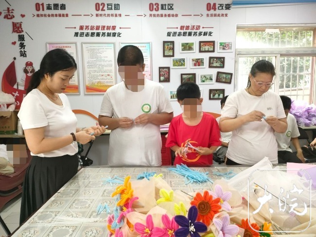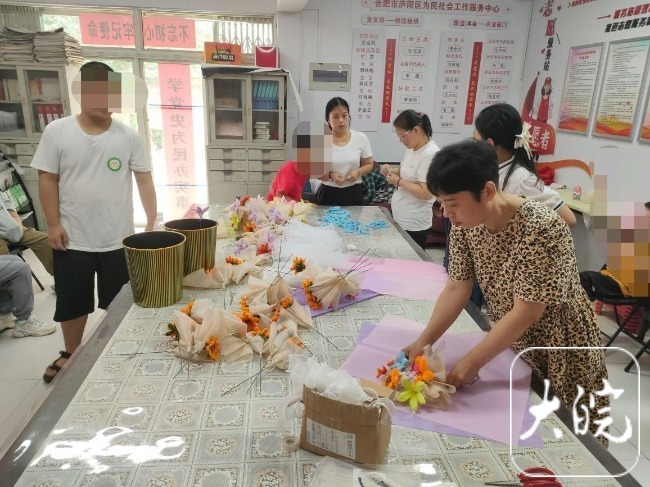 圖為幸福小院的孩子們在老師引導(dǎo)下,制作的手工花(幸福小院負(fù)責(zé)人李全志提供) 有了手工花制作 有了些收入 7月16日上午,在幸福小院的活動室,大皖新聞記者看到,18歲的晗晗和9歲的華仔正在特教老師和家長的陪伴下,制作手工花。華仔看在眼里記在心里,不需要提醒,知道每一步流程,會提前給老師遞工具,記下制作手工花的流程。去年三四月,華仔來到幸福小院,此前他沒有語言不會交流,但現(xiàn)在可以問一些簡單的問題,偶爾對話幾句?!八麆倎頃r一直性格急躁,經(jīng)過一年多的康復(fù)干預(yù),現(xiàn)在效果很明顯,像換了一個人似的。”徐艷老師告訴大皖新聞記者。
