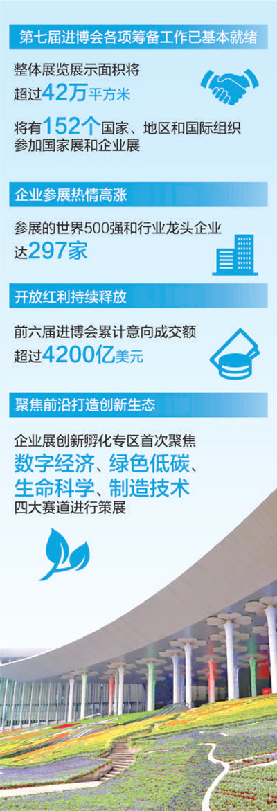 唐文弘介紹,第七屆進(jìn)博會(huì)各項(xiàng)籌備工作已基本就緒,整體展覽展示面積將超過42萬平方米,將有152個(gè)國(guó)家、地區(qū)和國(guó)際組織參加國(guó)家展和企業(yè)展,虹橋國(guó)際經(jīng)濟(jì)論壇將舉辦主論壇和19場(chǎng)分論壇。進(jìn)博會(huì)將從以下3個(gè)方面進(jìn)一步提升成效。
