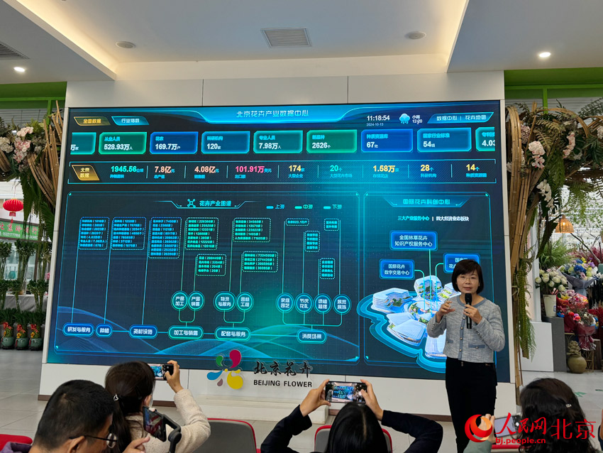 北京花鄉(xiāng)花木集團董事長林巧玲正在介紹“北京花卉”產業(yè)鏈數(shù)字平臺。人民網(wǎng)記者 鮑聰穎攝