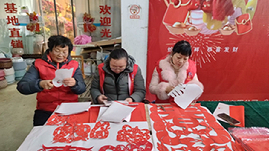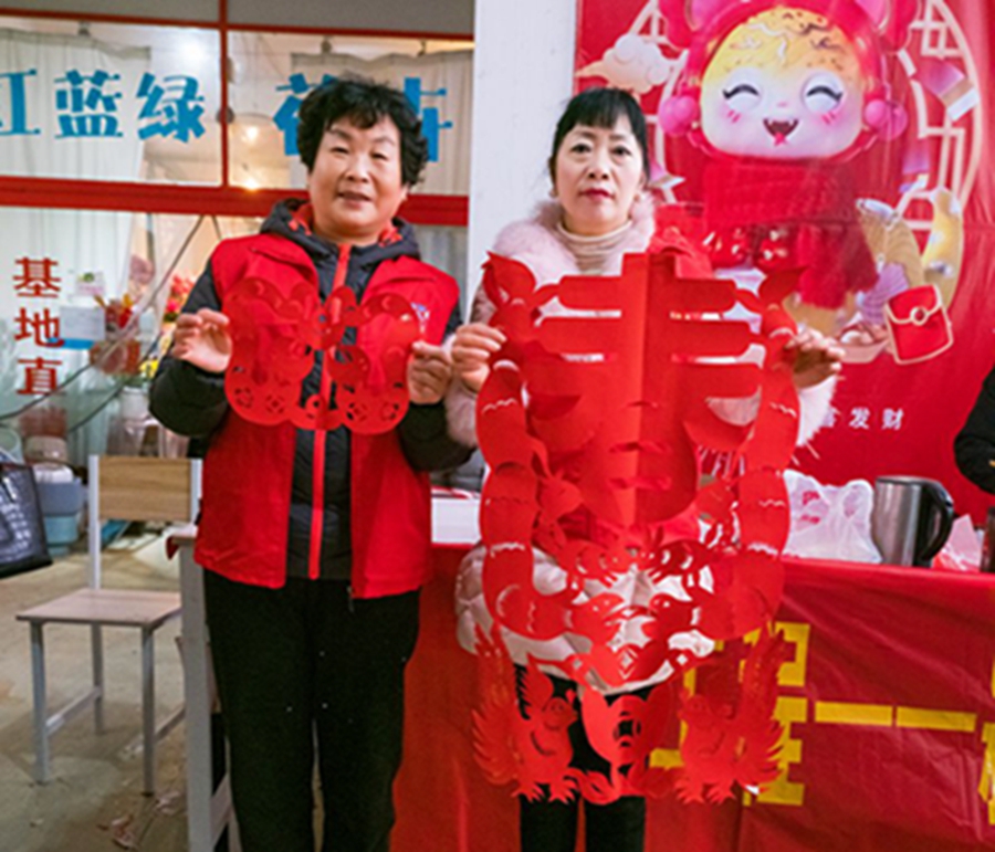 在陽光花卉大市場(chǎng)東門,書畫家們揮毫潑墨,舞動(dòng)新春氣息,春聯(lián)“小龍盤福字,大國領(lǐng)春風(fēng)”龍飛鳳舞;在另一端,大姐姑娘們,剪刀左右擺動(dòng),剪出栩栩如生的迎春剪紙圖案,吉祥如意。